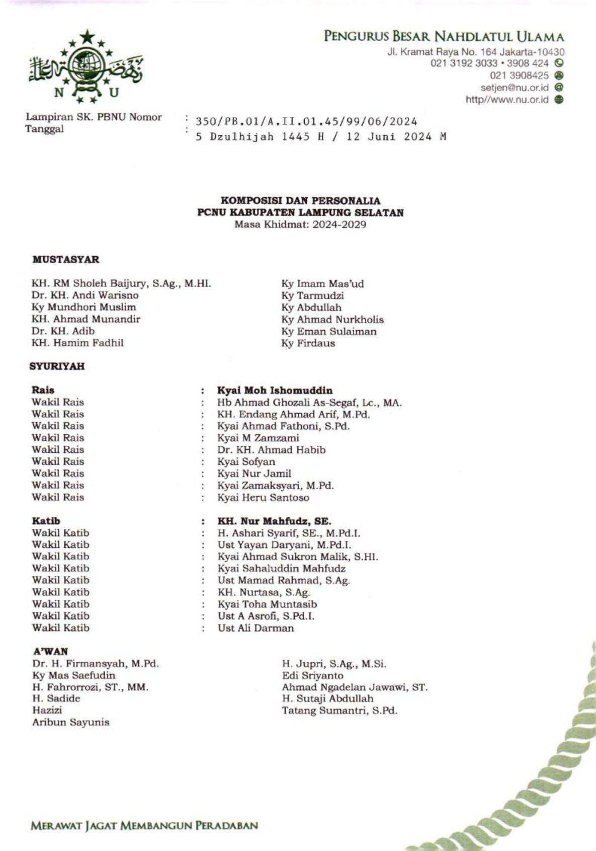 SK Pengurus PCNU Kabupaten Lampung Periode 2024-2029